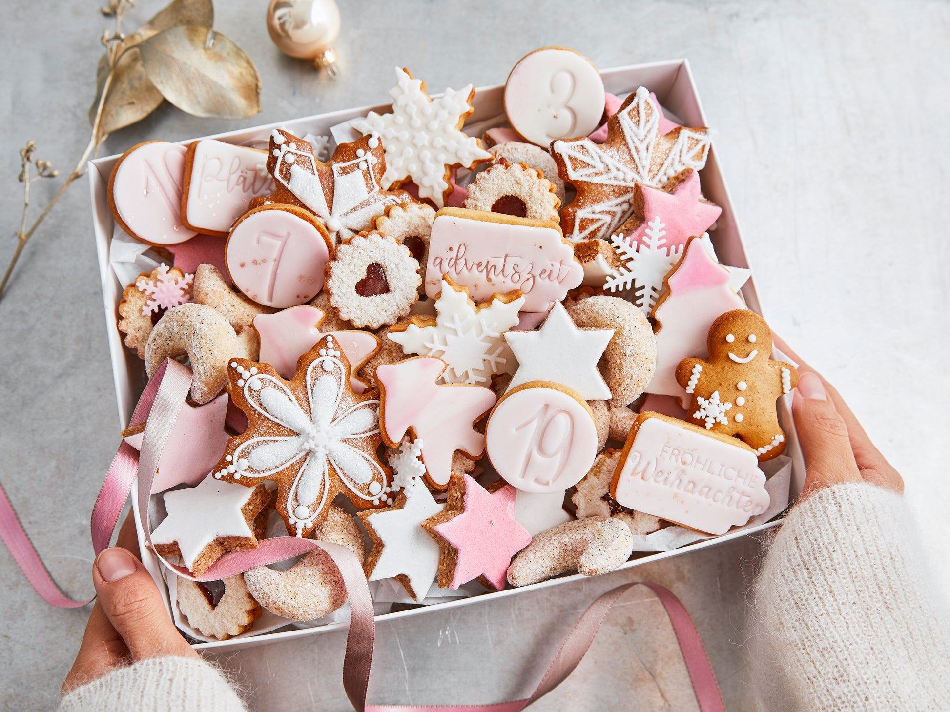 Du nimmst eine festlich gefüllte Box mit rund 500 g Gebäck mit nach Hause – perfekt zum Verschenken oder selber genießen.